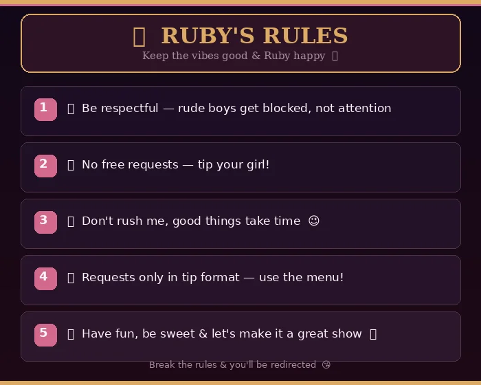 Hey there, I'm Ruby Luxe — your favorite guilty pleasure. I'm a curvy goddess with triple D's and a backside that'll have you coming back every single time. I love to tease, please, and put on a show that leaves you breathless. Come hang out, tip your girl, and let's have some fun you won't forget. 😈