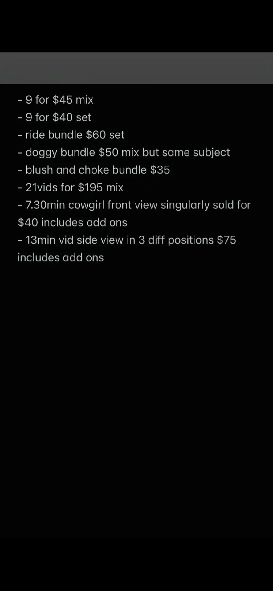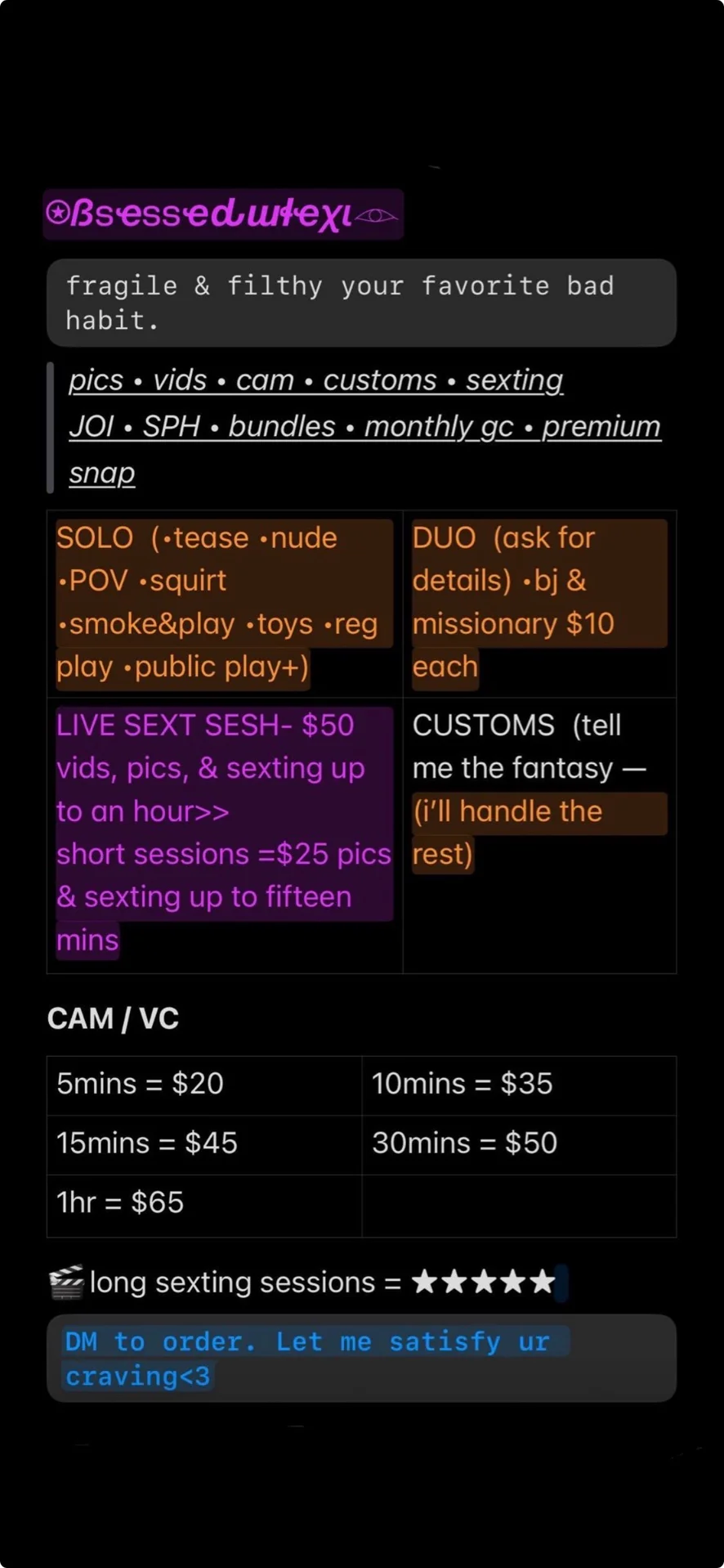 Blitzen, Fußfetisch, Erniedrigung, Wichs-Anleitung, Nylon, Rollenspiel, Rauchen, Versohlen, Striptease, Twerk, Anal-Spielzeug, Cock Rating, Dirty Talk, Doggy Style, Erotischer Tanz, Fingern, Knebeln, Dominas, Blowjob, Reiterstellung, Deepthroat, Dildo oder Vibrator, Fisten, Masturbation, Sexspielzeug, Dusche, Squirten
